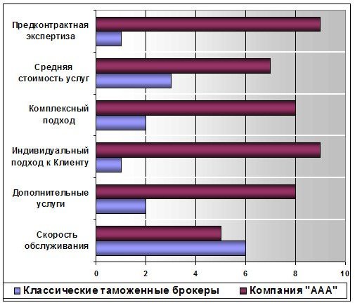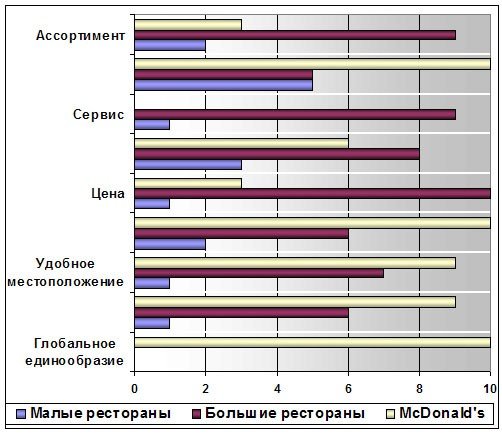 На примере, приведенном ниже, можно увидеть применение концепции «Стратегической канвы» при реализации практической задачи построения стратегии бизнеса. Слева рассмотрен «классический» вариант сравнения стратегической канвы больших (дорогих) ресторанов, малых (относительно дешевых) заведений и сети ресторанов быстрого питания McDonald’s. Справа приведен пример из практики автора данной статьи, который иллюстрирует отличия в стратегии фирм — таможенных брокеров, ориентированных на «массового» потребителя, и компании, условно названной «ААА», которая стремится реализовать новые подходы в развитии данного вида услуг.
