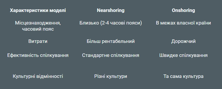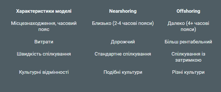 - Nearshore — в країнах, що розташовані близько за відстанню та у межах 2-3 часових поясів.